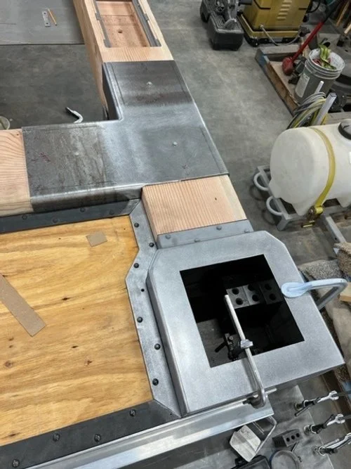 Outdoor Patio Beams (press broke 10 gauge over I-beams and reclaimed auger post